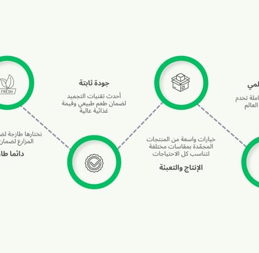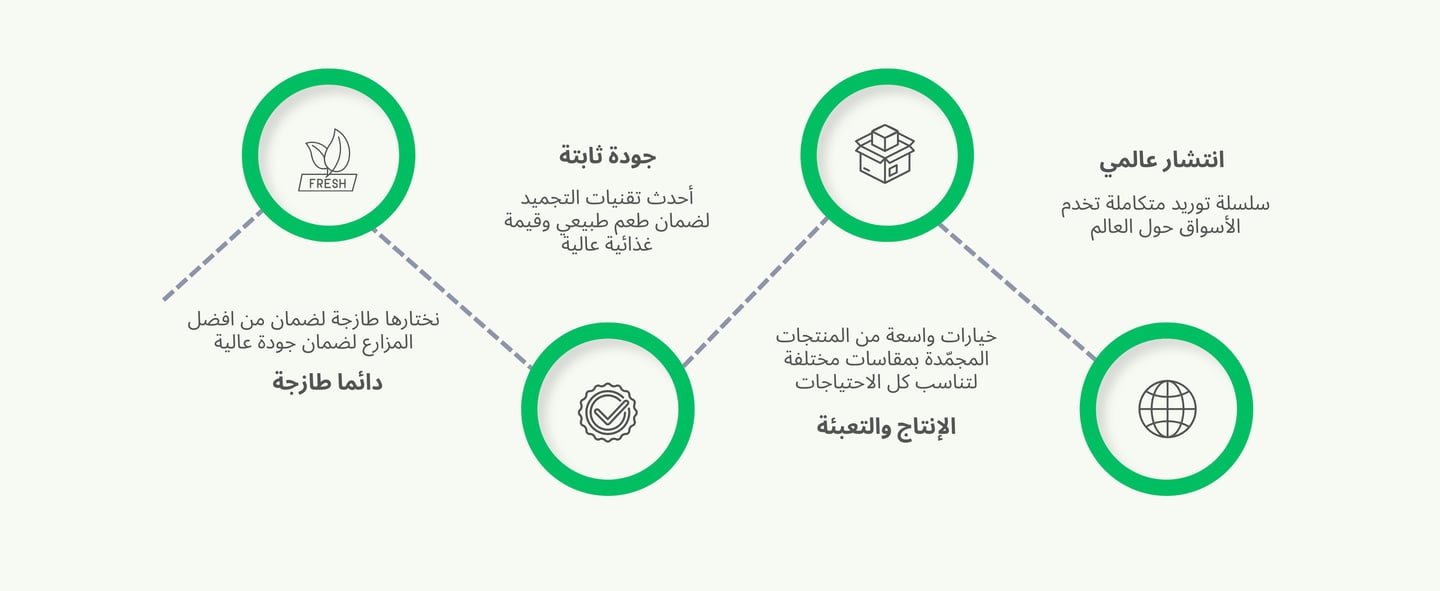 • نعتمد أحدث التقنيات في كل مرحلة من مراحل الإنتاج لضمان جودة متميزة، من الزراعة والحصاد، مرورًا بالمعالجة والتجميد، وصولًا إلى التوزيع والشحن حول العالم.